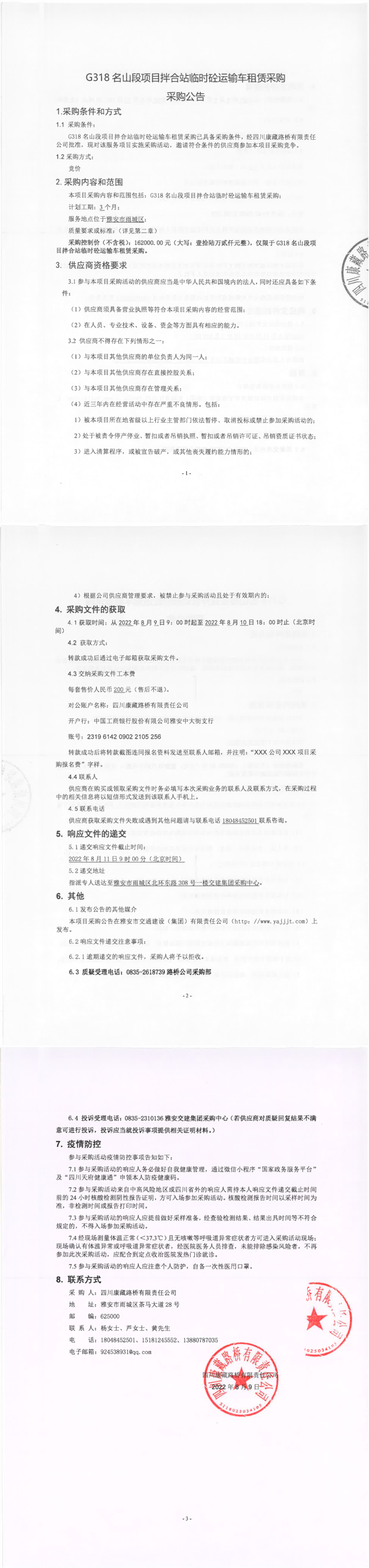 四川康藏路橋有限責(zé)任公司G318名山段項目拌合站臨時砼運(yùn)輸車租賃采購采購公告