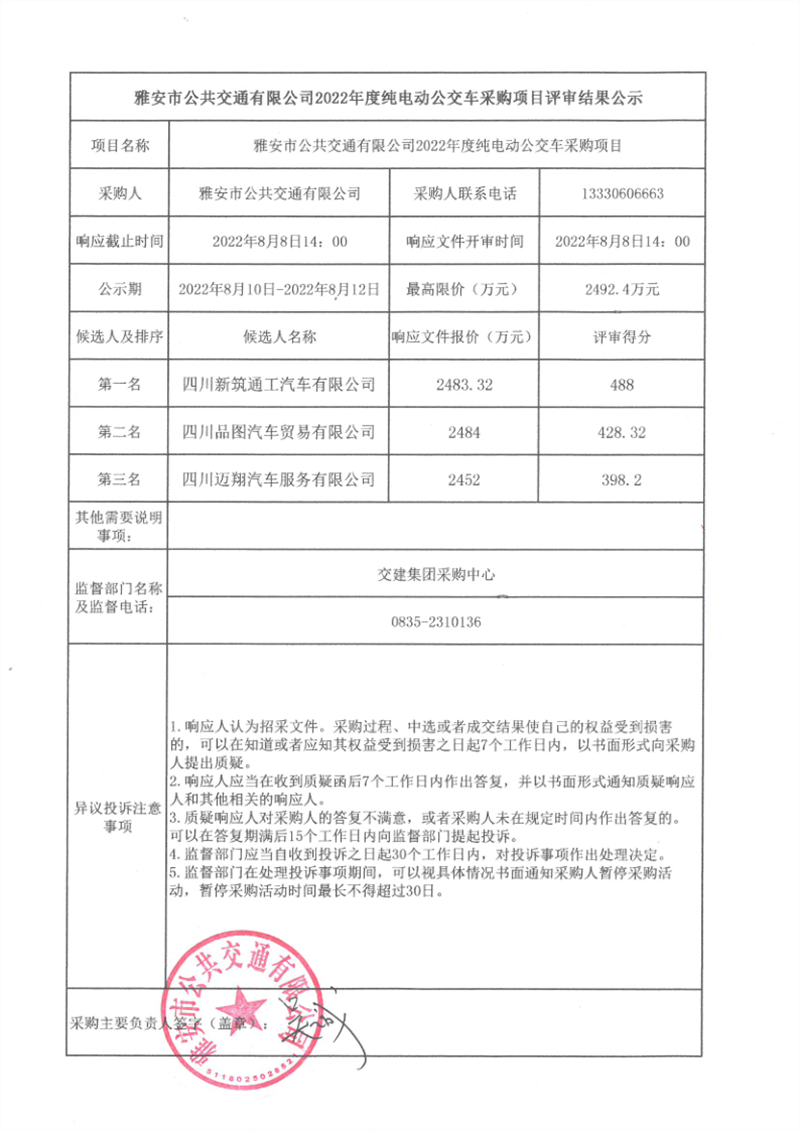 雅安市公共交通有限公司2022年度純電動公交車采購項目評審結果公示