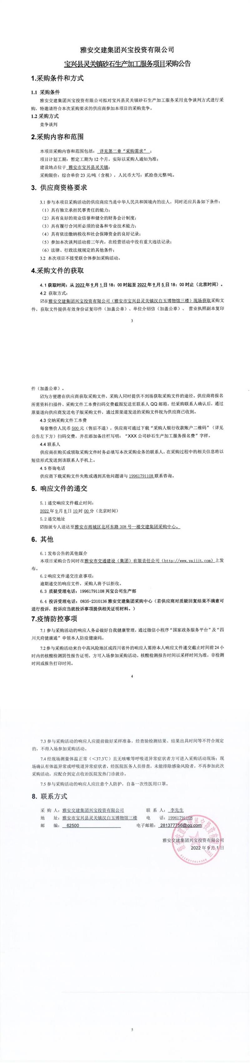 雅安交建集團興寶投資有限公司寶興縣靈關(guān)鎮(zhèn)砂石生產(chǎn)加工服務(wù)項目采購公告