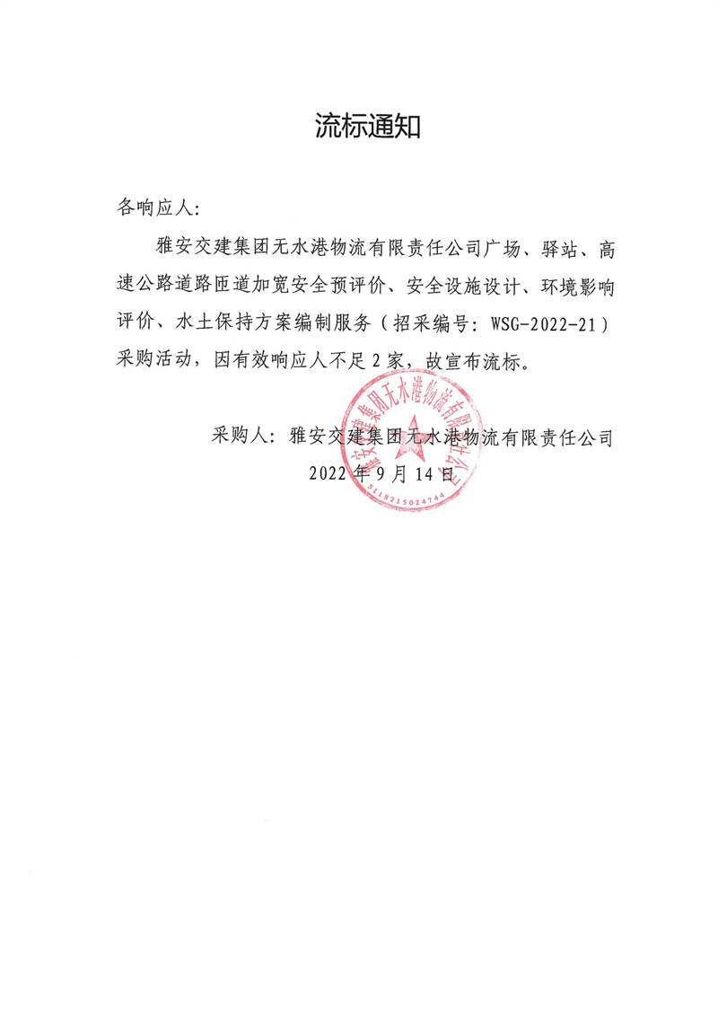 雅安交建集團(tuán)無(wú)水港物流有限責(zé)任公司廣場(chǎng)、驛站、高速公路道路匝道加寬安全預(yù)評(píng)價(jià)、安全設(shè)施設(shè)計(jì)、環(huán)境影響評(píng)價(jià)、水土保持方案編制服務(wù)采購(gòu)流標(biāo)通知