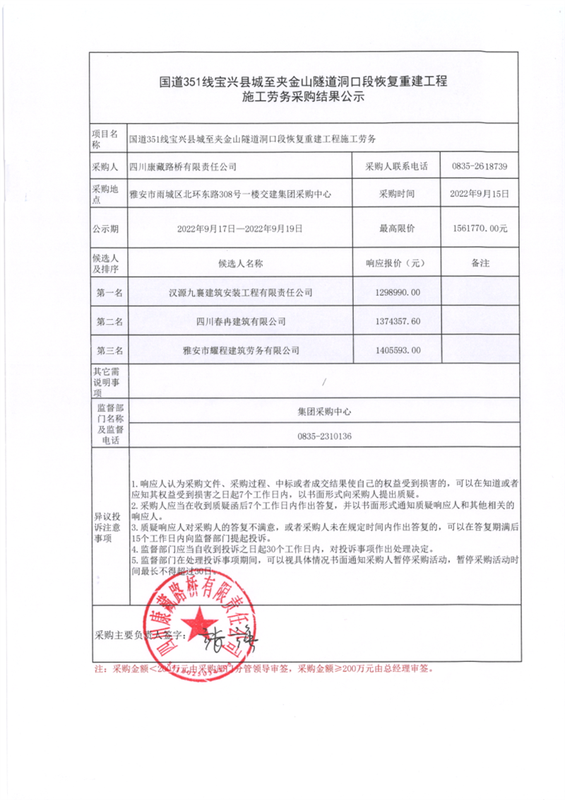 四川康藏路橋有限責(zé)任公司國道351線寶興縣城至夾金山隧道洞口段恢復(fù)重建工程施工勞務(wù)采購結(jié)果公示