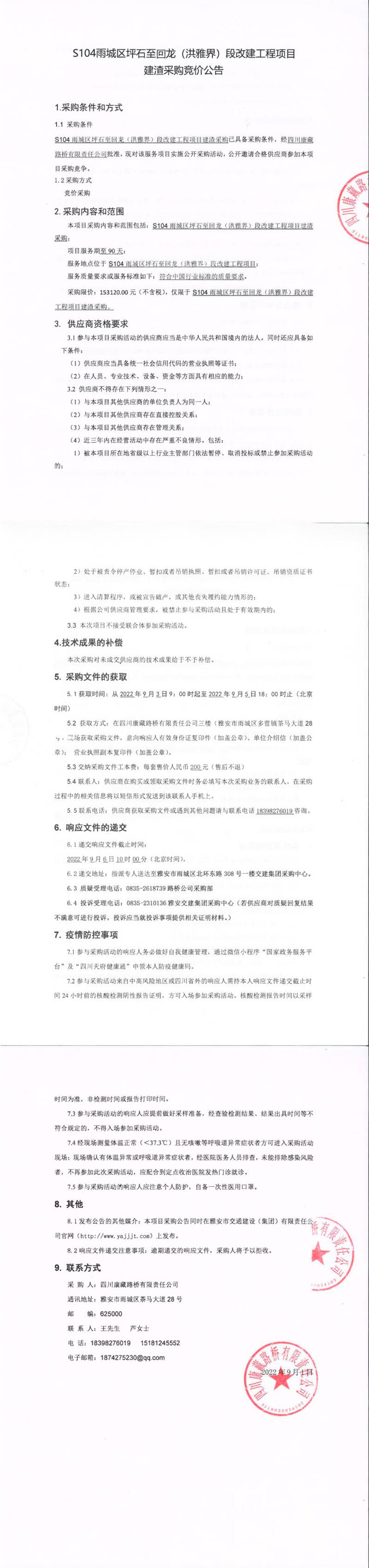 四川康藏路橋有限責(zé)任公司S104雨城區(qū)坪石至回龍(洪雅界)段改建工程項(xiàng)目建渣采購(gòu)競(jìng)價(jià)公告