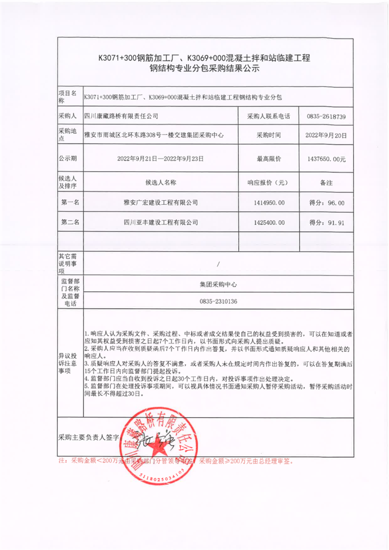 四川康藏路橋有限責(zé)任公司K3071+300鋼筋加工廠、K3069+000混凝土拌和站臨建工程鋼結(jié)構(gòu)專業(yè)分包采購(gòu)結(jié)果公示