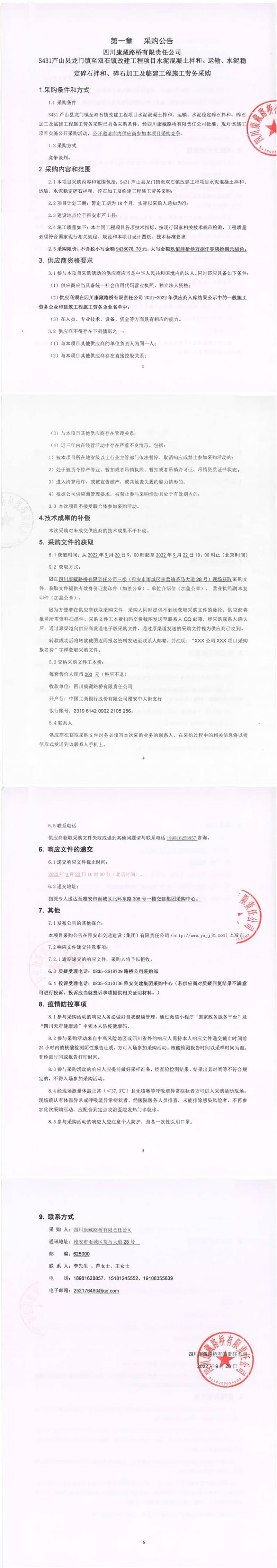 四川康藏路橋有限責(zé)任公司S431蘆山縣龍門鎮(zhèn)至雙石鎮(zhèn)改建工程項目水泥混凝土拌和、運輸、水泥穩(wěn)定碎石拌和、碎石加工及臨建工程施工勞務(wù)采購公告