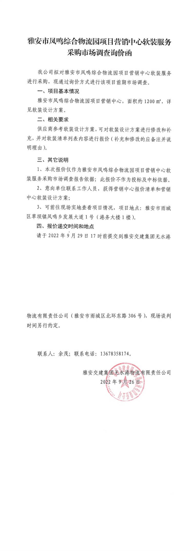雅安交建集團無水港物流有限責任公司雅安市鳳鳴綜合物流園項目營銷中心軟裝服務采購市場調查詢價函