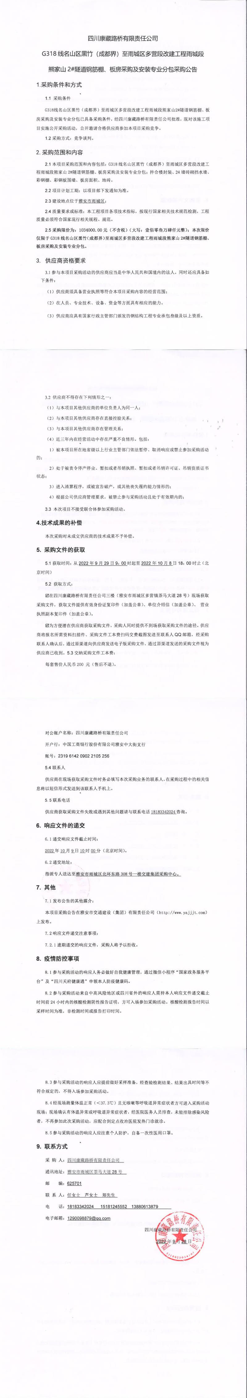 四川康藏路橋有限責任公司G318線名山區(qū)黑竹(成都界)至雨城區(qū)多營段改建工程雨城段熊家山2#隧道鋼筋棚、板房采購及安裝專業(yè)分包采購公告