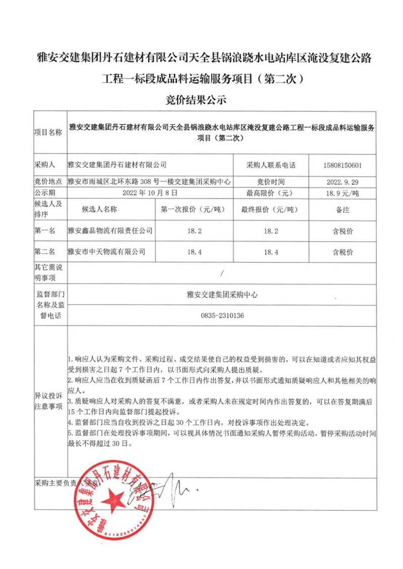 雅安交建集團丹石建材有限公司天全縣鍋浪蹺水電站庫區(qū)淹沒復建公路工程一標段成品料運輸服務項目(第二次)競價結(jié)果公示