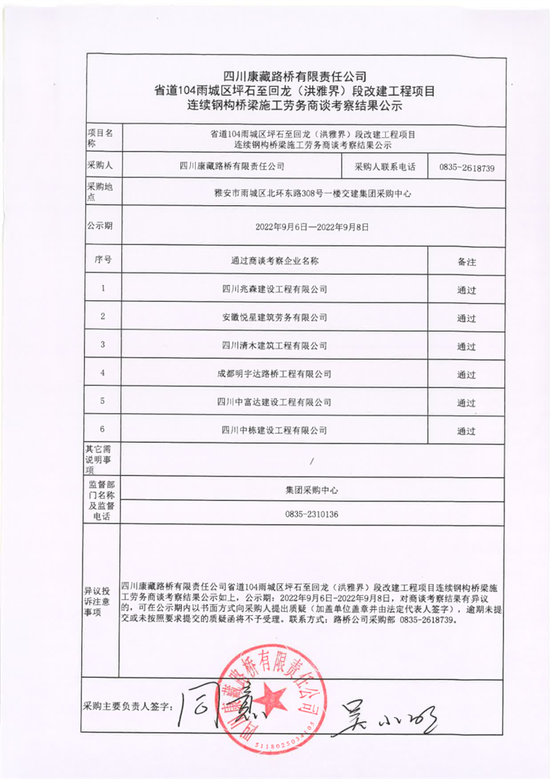 四川康藏路橋有限責任公司省道104雨城區(qū)坪石至回龍(洪雅界)段改建工程項目連續(xù)鋼構(gòu)橋梁施工勞務(wù)商談考察結(jié)果公示