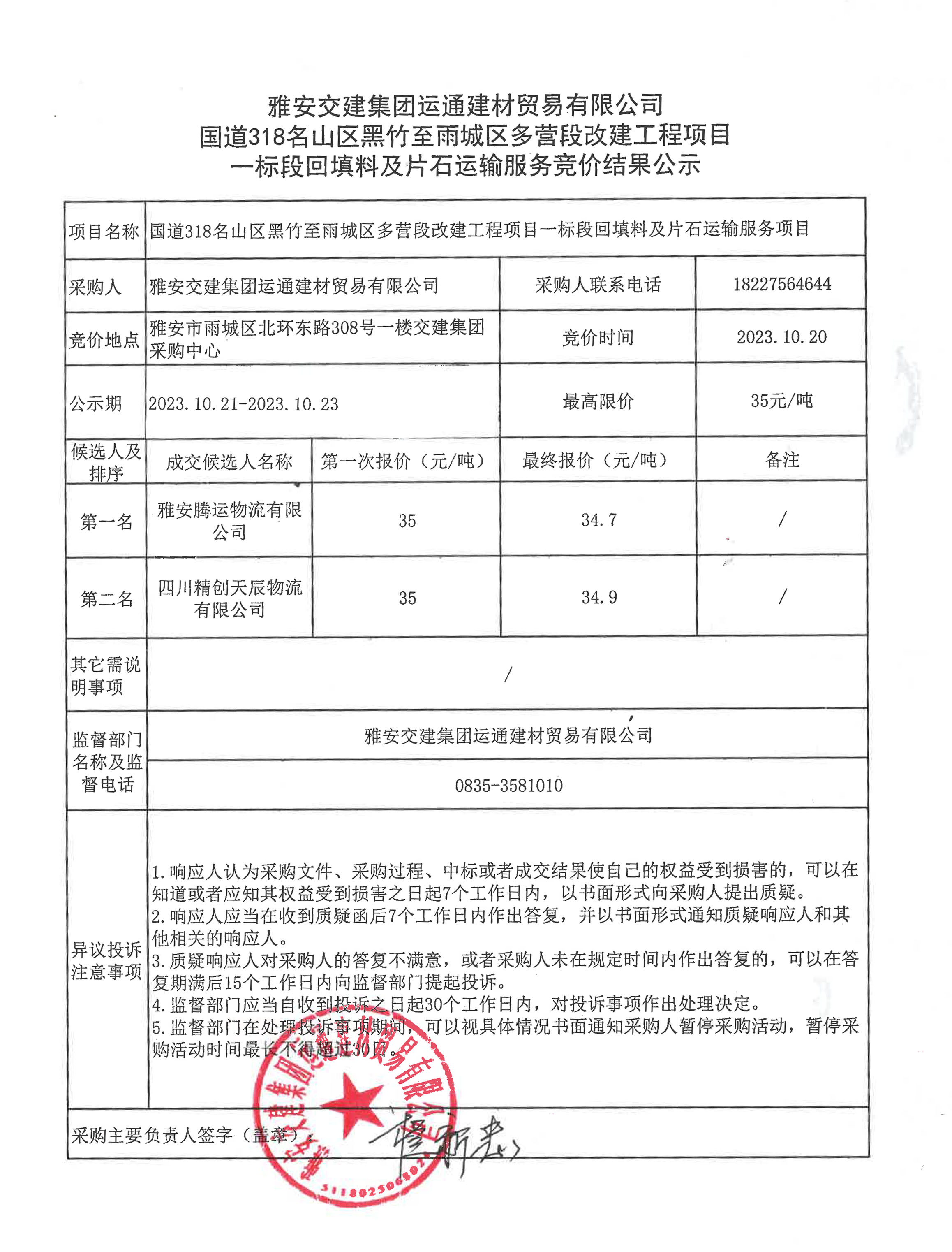 雅安交建集團(tuán)運(yùn)通建材貿(mào)易有限公司 國(guó)道318名山區(qū)黑竹至雨城區(qū)多營(yíng)段改建工程項(xiàng)目一標(biāo)段回填料及片石運(yùn)輸服務(wù)競(jìng)價(jià)結(jié)果公示