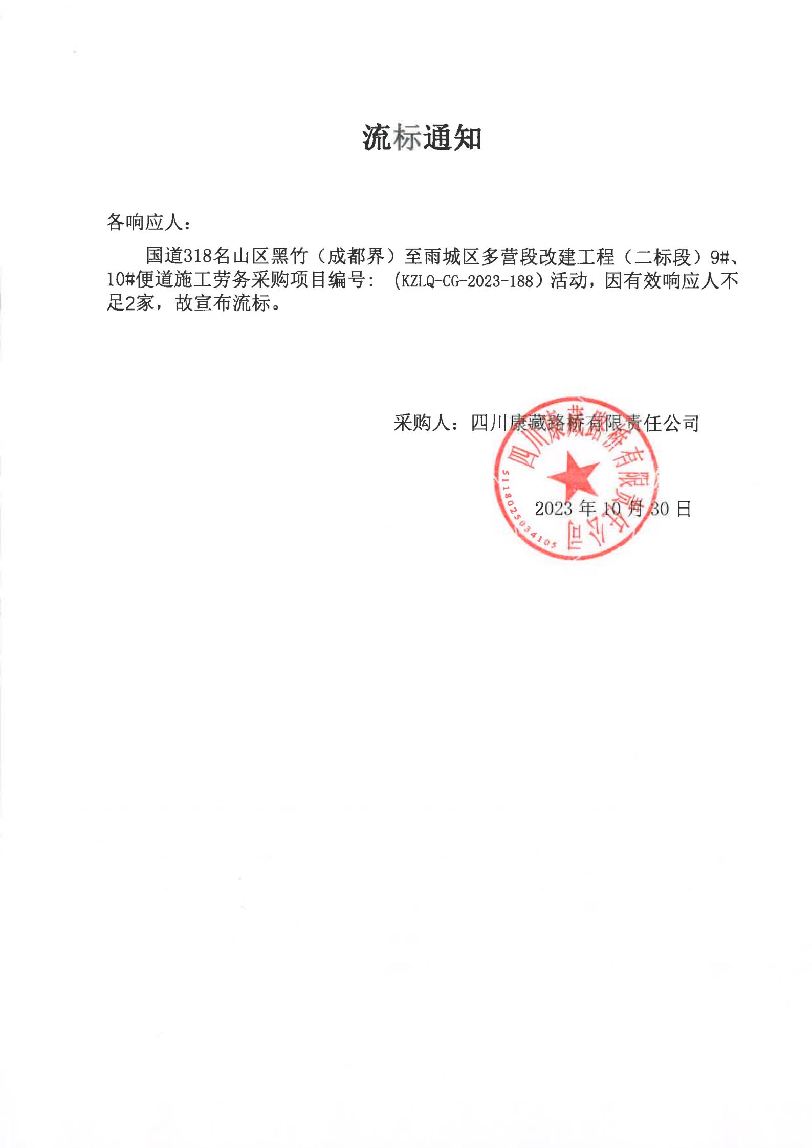 四川康藏路橋有限責(zé)任公司國道318名山區(qū)黑竹(成都界)至雨城區(qū)多營段改建工程(二標(biāo)段)9#、10#便道施工勞務(wù)采購流標(biāo)通知