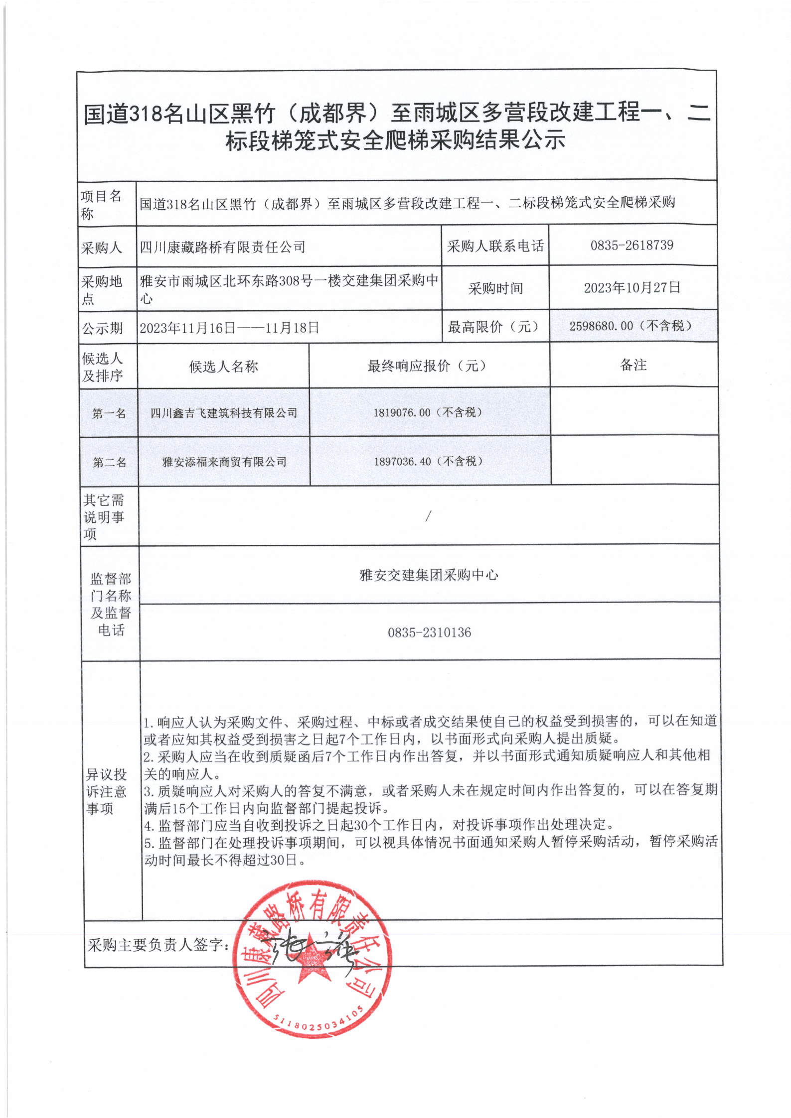 四川康藏路橋有限責(zé)任公司國(guó)道318名山區(qū)黑竹(成都界)至雨城區(qū)多營(yíng)段改建工程一、二標(biāo)段梯籠式安全爬梯采購(gòu)結(jié)果公示