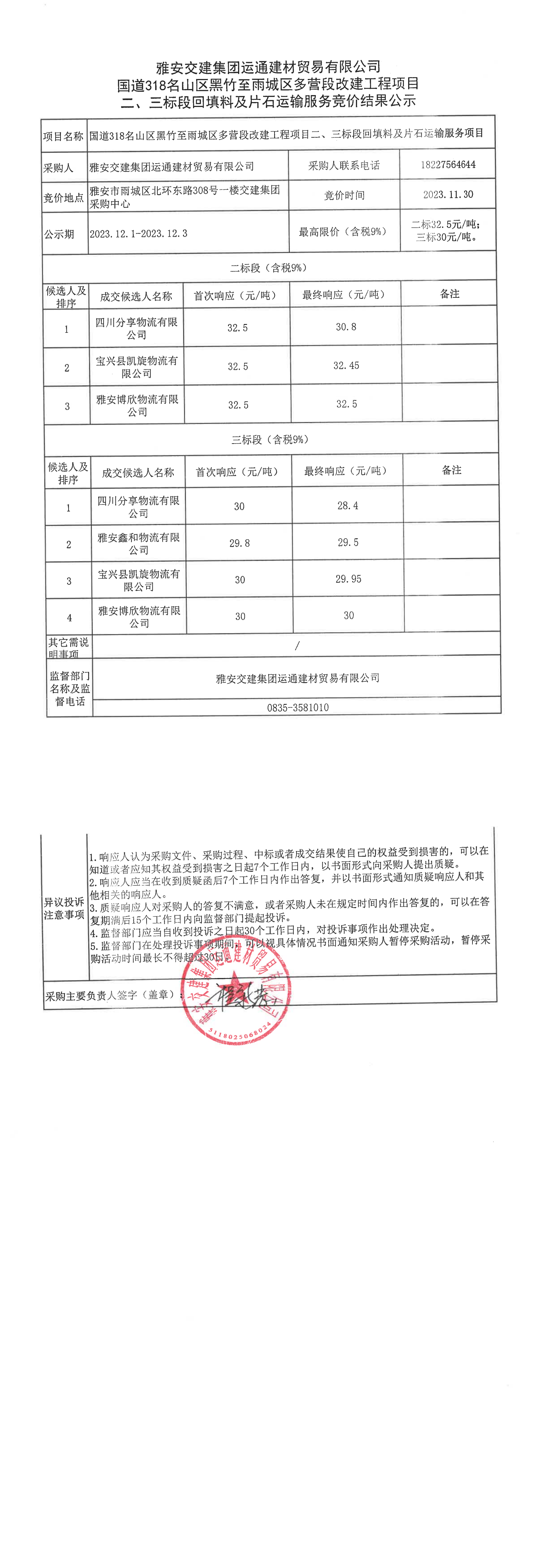 雅安交建集團(tuán)運(yùn)通建材貿(mào)易有限公司國道318名山區(qū)黑竹至雨城區(qū)多營段改建工程項(xiàng)目二、三標(biāo)段回填料、片石運(yùn)輸服務(wù)競(jìng)價(jià)結(jié)果公示