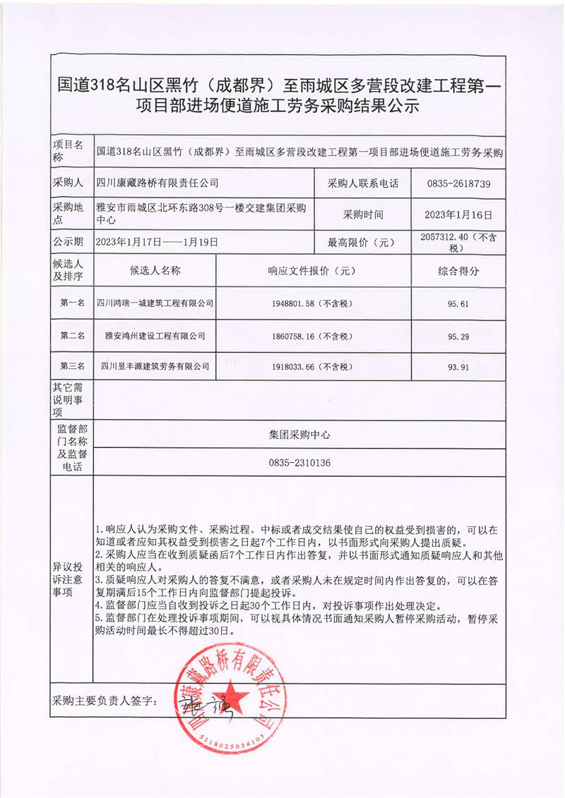 四川康藏路橋有限責(zé)任公司國道318名山區(qū)黑竹(成都界)至雨城區(qū)多營段改建工程第一項目部進(jìn)場便道施工勞務(wù)采購結(jié)果公示