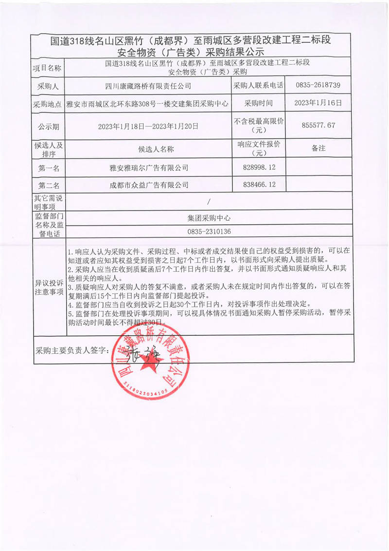 四川康藏路橋有限責(zé)任公司國(guó)道318線名山區(qū)黑竹(成都界)至雨城區(qū)多營(yíng)段改建工程二標(biāo)段安全物資(廣告類(lèi))采購(gòu)結(jié)果公示
