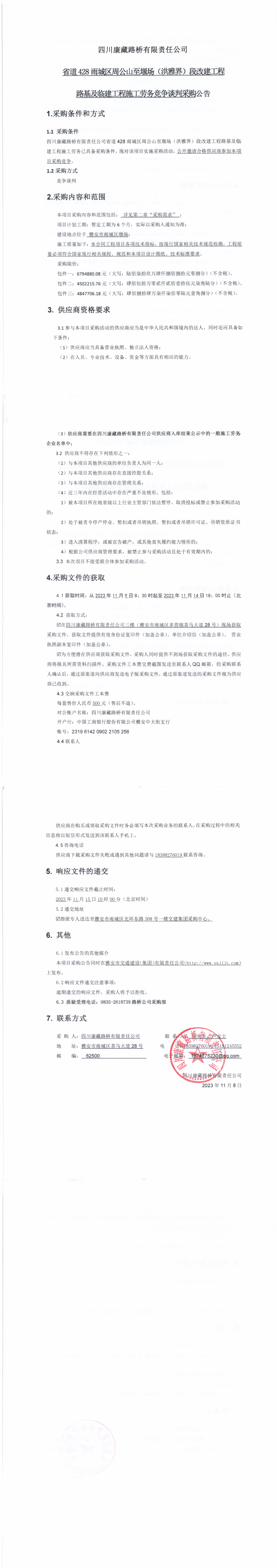 四川康藏路橋有限責任公司省道428雨城區(qū)周公山至堰場(洪雅界)段改建工程路基及臨建工程施工勞務(wù)競爭談判采購公告