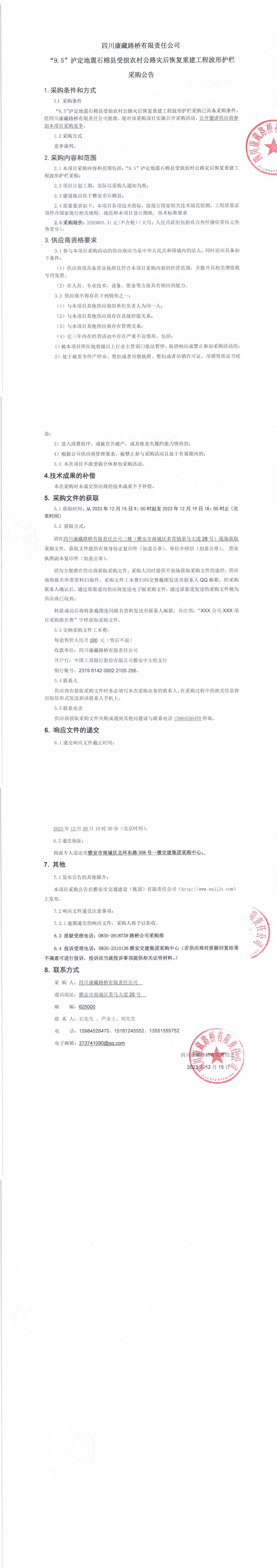 四川康藏路橋有限責(zé)任公司“9.5”瀘定地震石棉縣受損農(nóng)村公路災(zāi)后恢復(fù)重建工程波形護(hù)欄采購(gòu)公告