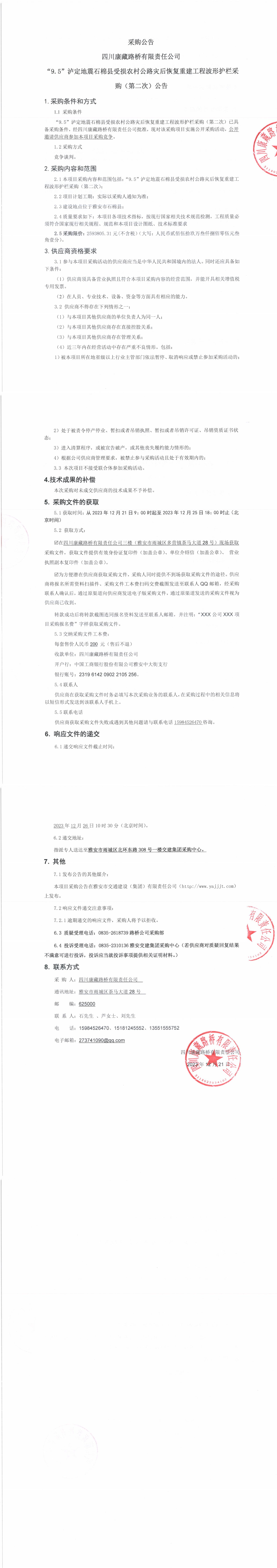 四川康藏路橋有限責任公司“9.5”瀘定地震石棉縣受損農村公路災后恢復重建工程波形護欄采購(第二次)公告