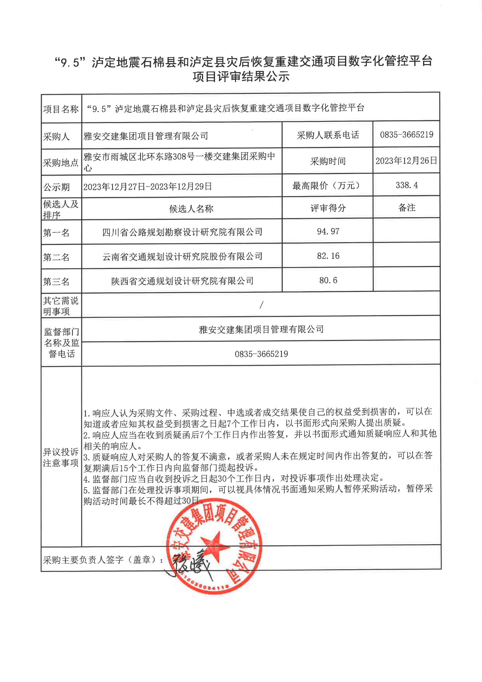 雅安交建集團(tuán)項(xiàng)目管理有限公司“9.5”瀘定地震石棉縣和瀘定縣災(zāi)后恢復(fù)重建交通項(xiàng)目數(shù)字化管控平臺(tái)項(xiàng)目評審結(jié)果公示