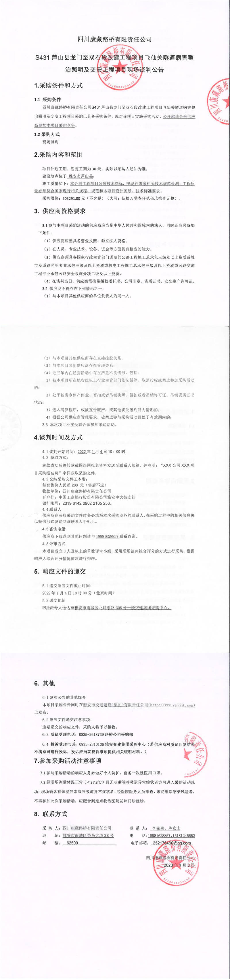 四川康藏路橋有限責任公司S431蘆山縣龍門至雙石段改建工程項目飛仙關隧道病害整治照明及交安工程項目現場談判公告