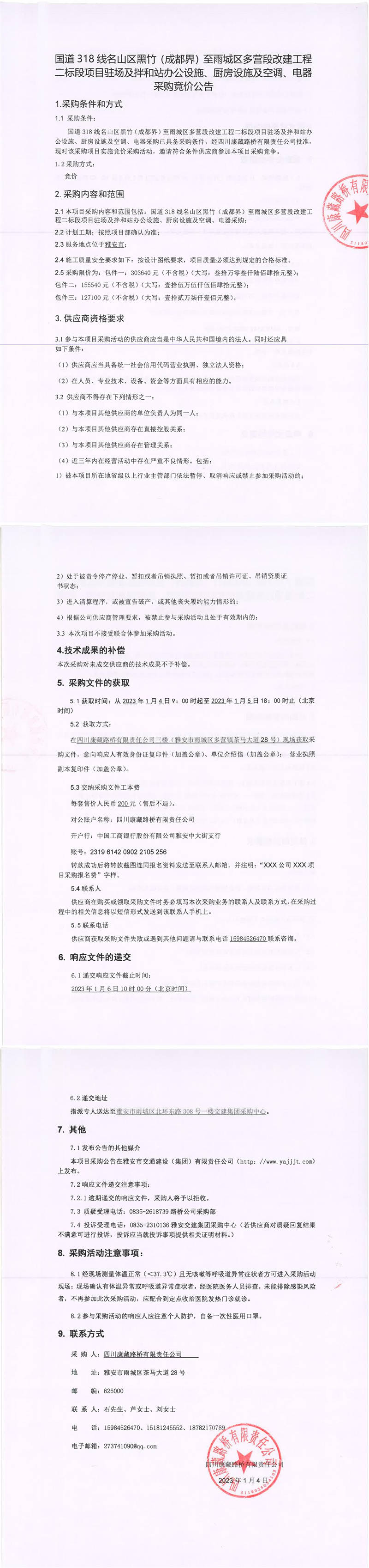 四川康藏路橋有限責(zé)任公司國(guó)道318線(xiàn)名山區(qū)黑竹(成都界)至雨城區(qū)多營(yíng)段改建工程二標(biāo)段項(xiàng)目駐場(chǎng)及拌和站辦公設(shè)施、廚房設(shè)施及空調(diào)、電器采購(gòu)競(jìng)價(jià)公告
