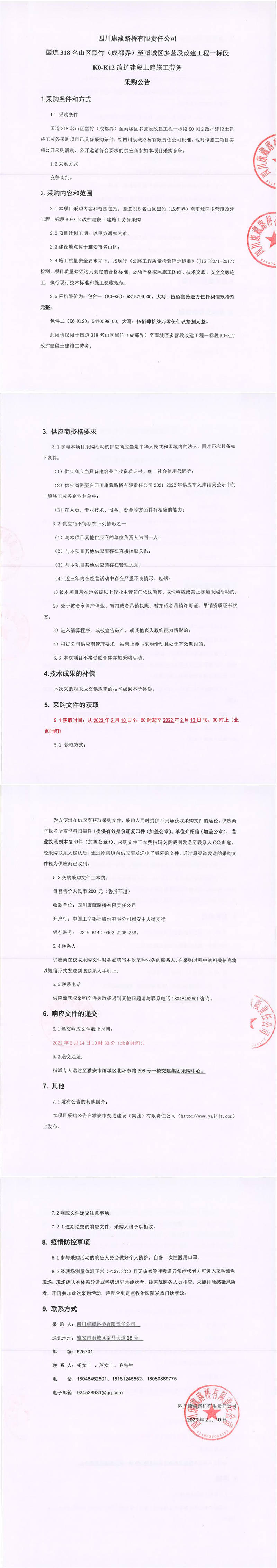 四川康藏路橋有限責任公司國道318名山區(qū)黑竹(成都界)至雨城區(qū)多營段改建工程一標段K0-K12改擴建段土建施工勞務采購公告