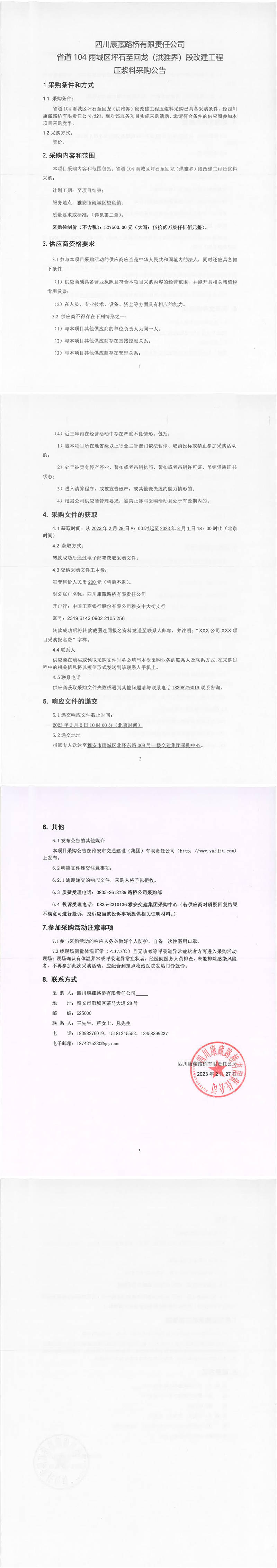 四川康藏路橋有限責(zé)任公司省道104雨城區(qū)坪石至回龍(洪雅界)段改建工程壓漿料采購(gòu)公告