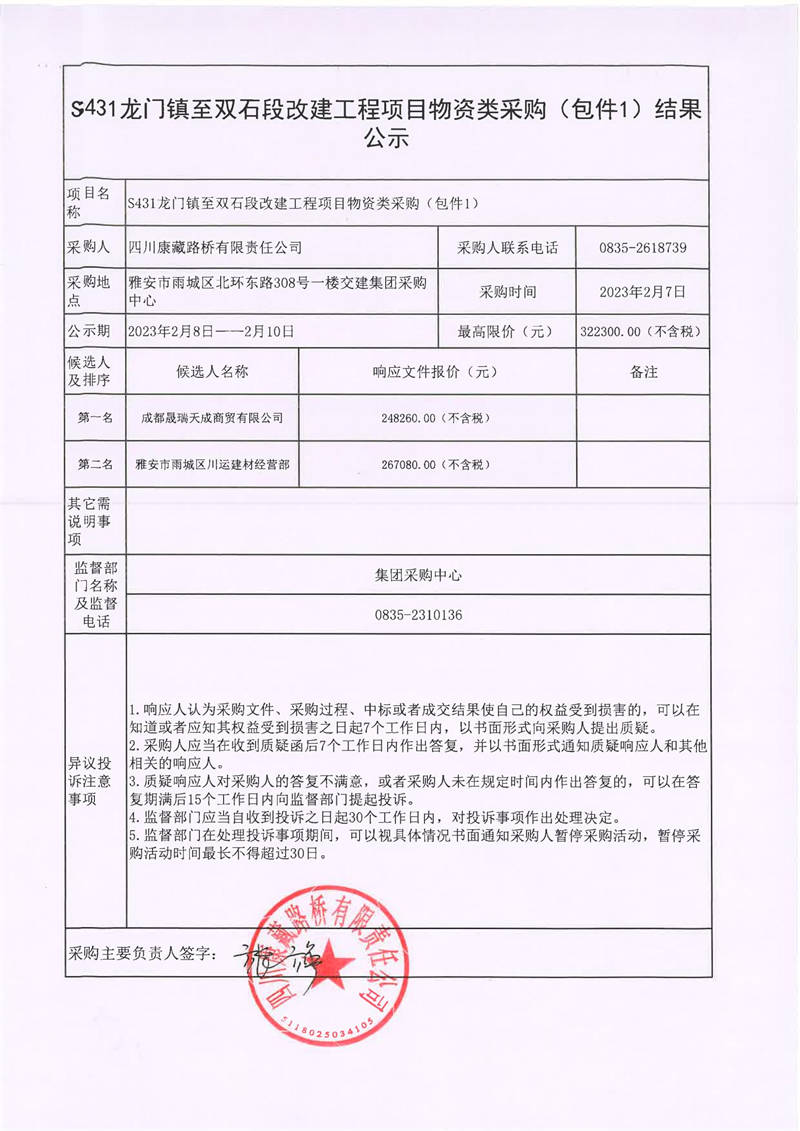 四川康藏路橋有限責(zé)任公司S431龍門鎮(zhèn)至雙石段改建工程項(xiàng)目物資類采購(包件1、包件2)結(jié)果公示