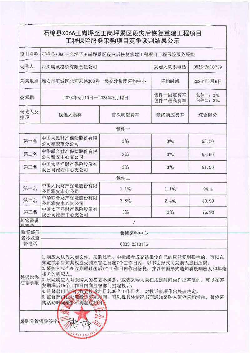 四川康藏路橋有限責任公司石棉縣X066王崗坪至王崗坪景區(qū)段災(zāi)后恢復(fù)重建工程項目工程保險服務(wù)采購競爭談判結(jié)果公示