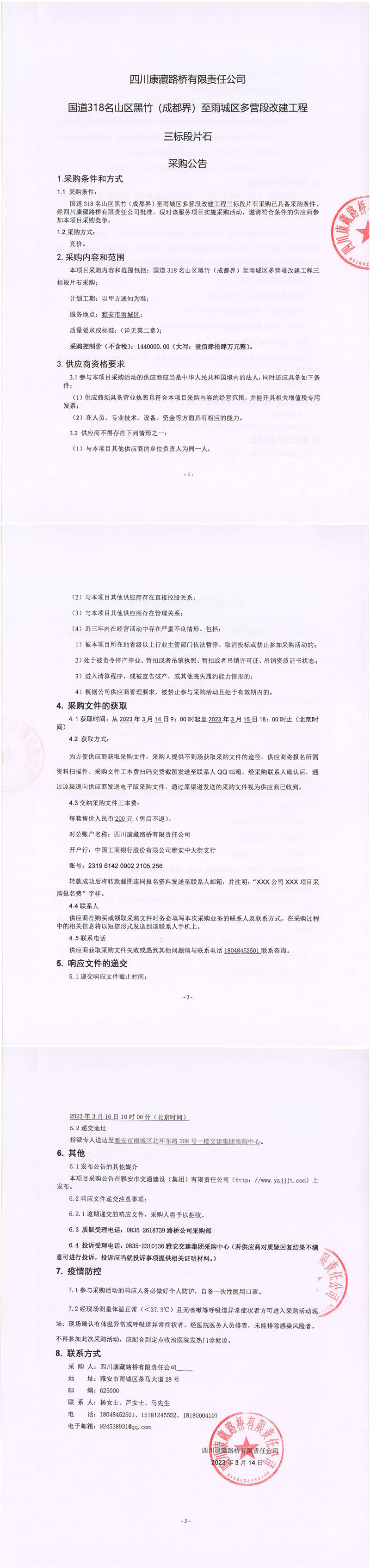 四川康藏路橋有限責(zé)任公司國道318名山區(qū)黑竹(成都界)至雨城區(qū)多營段改建工程三標(biāo)段片石采購公告