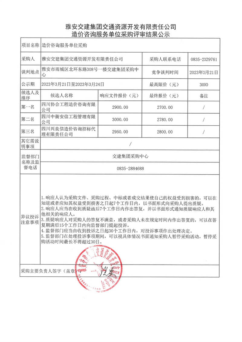 雅安交建集團(tuán)交通資源開發(fā)有限責(zé)任公司造價(jià)咨詢服務(wù)單位采購(gòu)評(píng)審結(jié)果公示