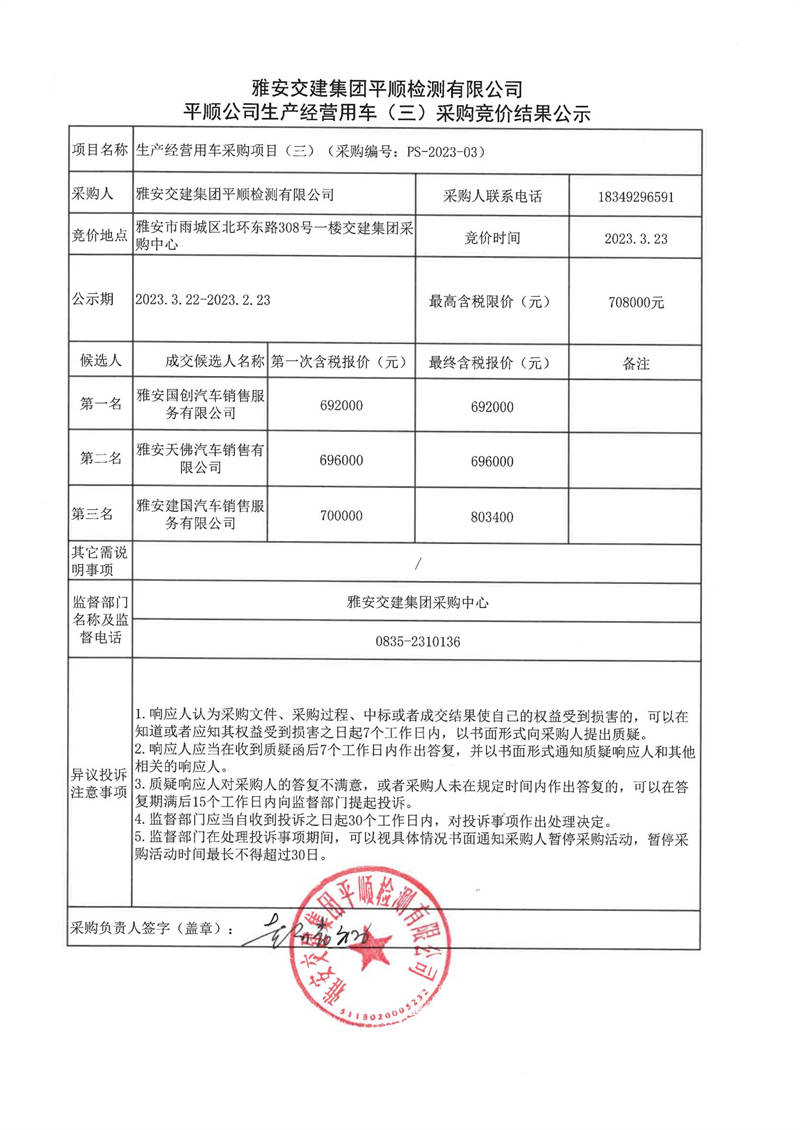雅安交建集團(tuán)平順檢測(cè)有限公司平順公司生產(chǎn)經(jīng)營(yíng)用車(chē)(二)采購(gòu)競(jìng)價(jià)結(jié)果公示