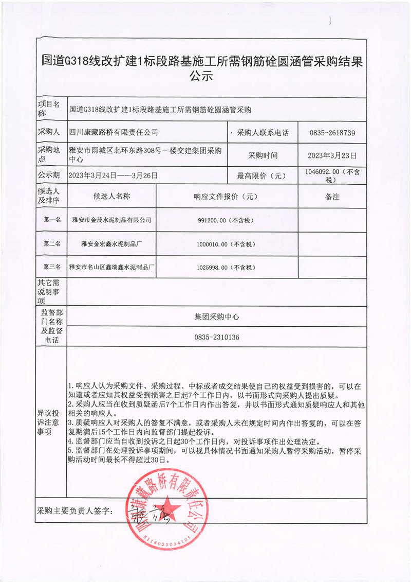 四川康藏路橋有限責(zé)任公司石國道G318擴建1標(biāo)段路基施工所需鋼筋砼圓涵管采購結(jié)果公示