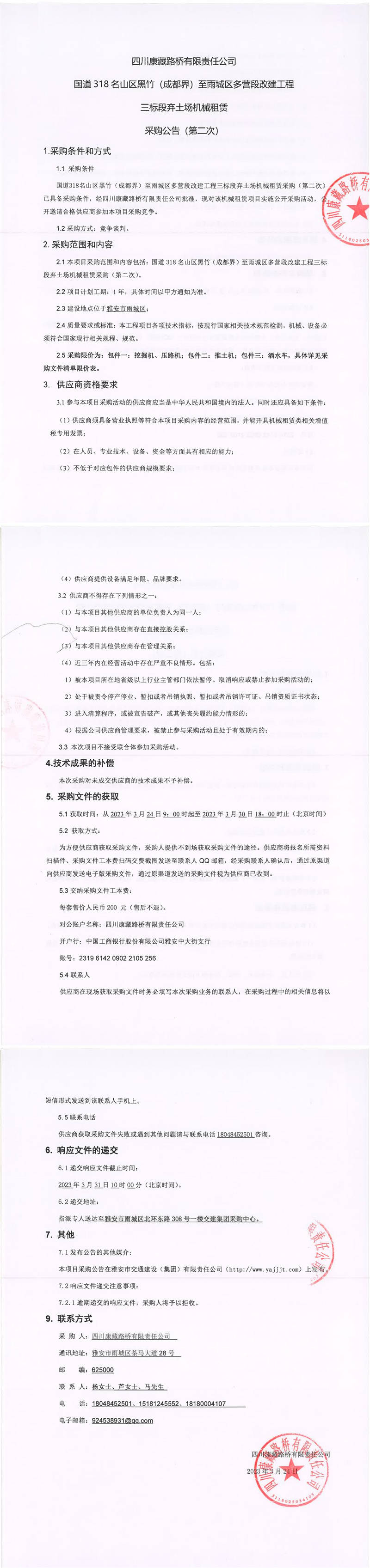 四川康藏路橋有限責(zé)任公司國道318名山區(qū)黑竹(成都界)至雨城區(qū)多營段改建工程三標(biāo)段棄土場機(jī)械租賃采購公告(第二次)