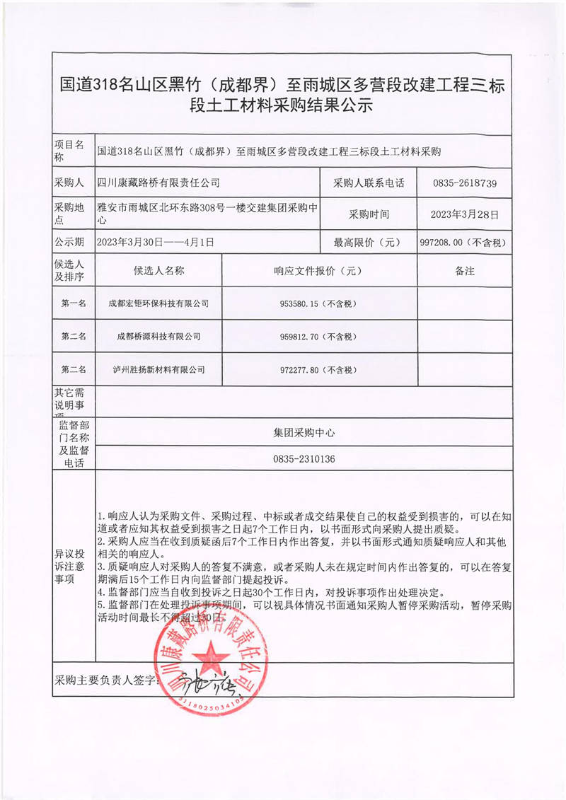 四川康藏路橋有限責任公司國道318名山區(qū)黑竹(成都界)至雨城區(qū)多營段改建工程三標段土工材料采購結果公示