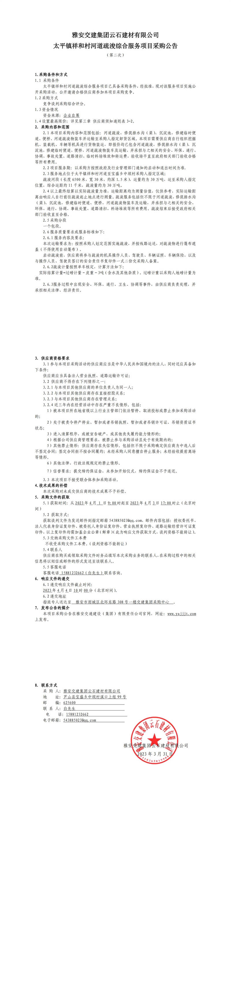 雅安交建集團(tuán)云石建材有限公司太平鎮(zhèn)祥和村河道疏浚綜合服務(wù)項目采購公告(第二次)