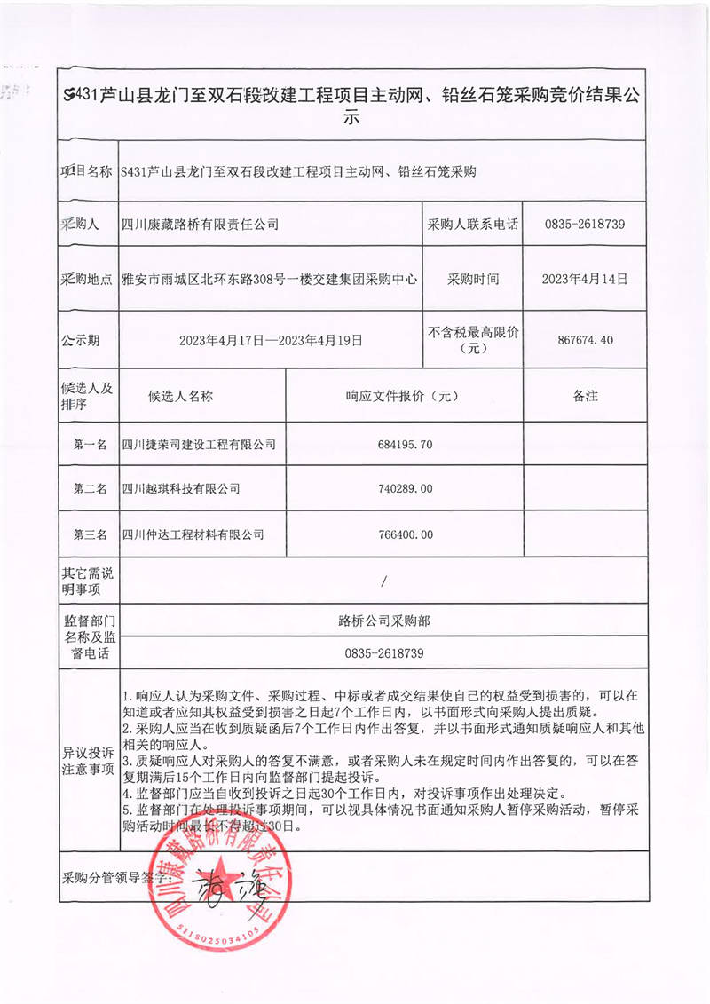 四川康藏路橋有限責任公司S431蘆山縣龍門至雙石段改建工程項目主動網、鉛絲石籠采購競價結果公示