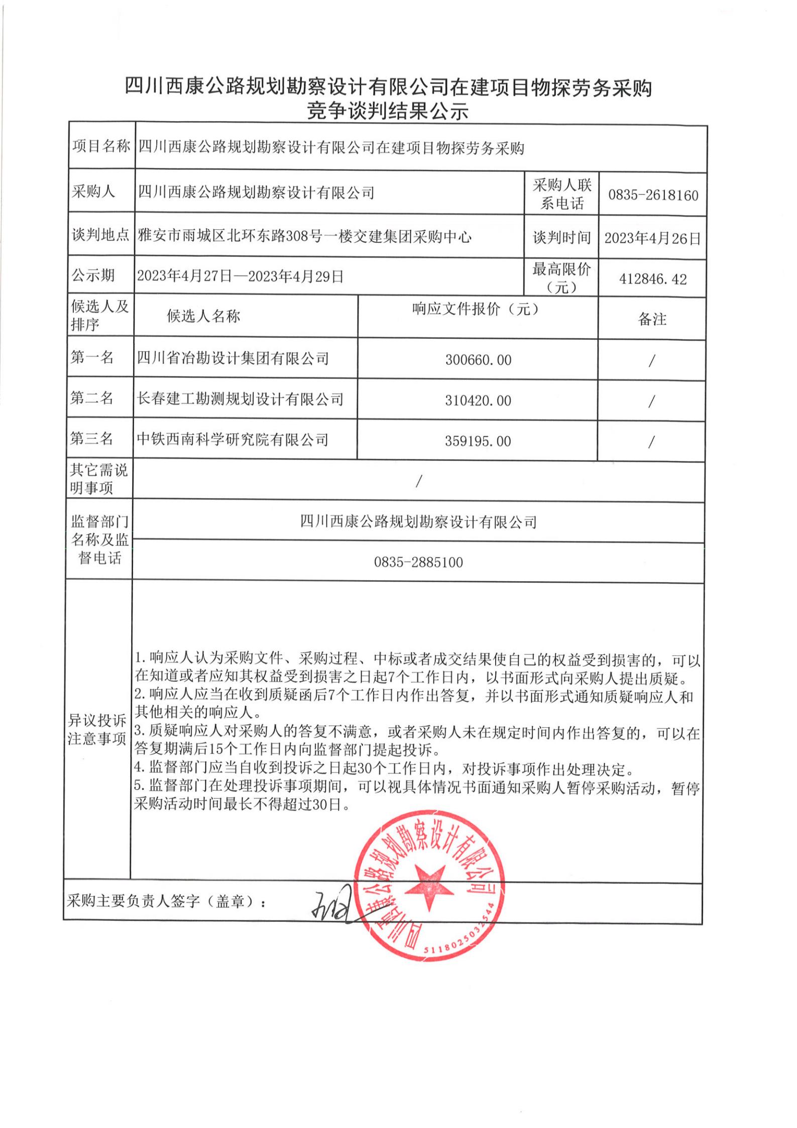 四川西康公路規(guī)劃勘察設計有限公司在建項目物探勞務采購競爭談判結(jié)果公示