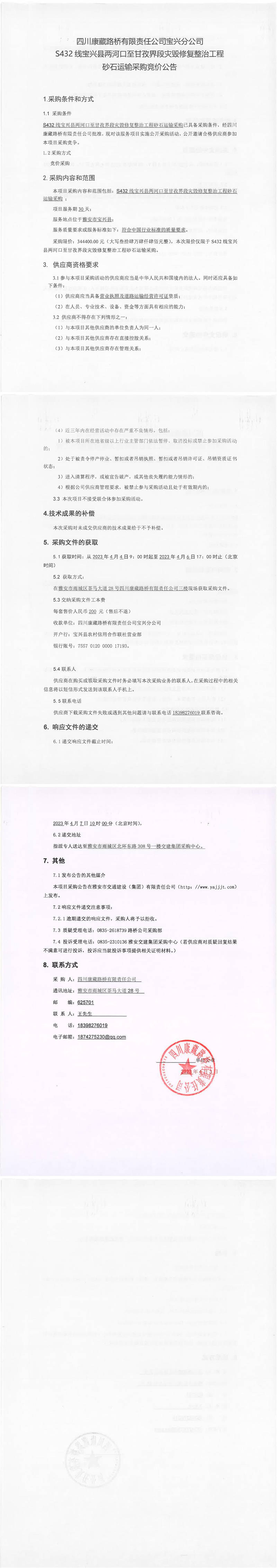四川康藏路橋有限責(zé)任公司寶興分公司S432寶興縣兩河口至甘孜界段災(zāi)毀修復(fù)整治工程砂石運(yùn)輸采購競價公告