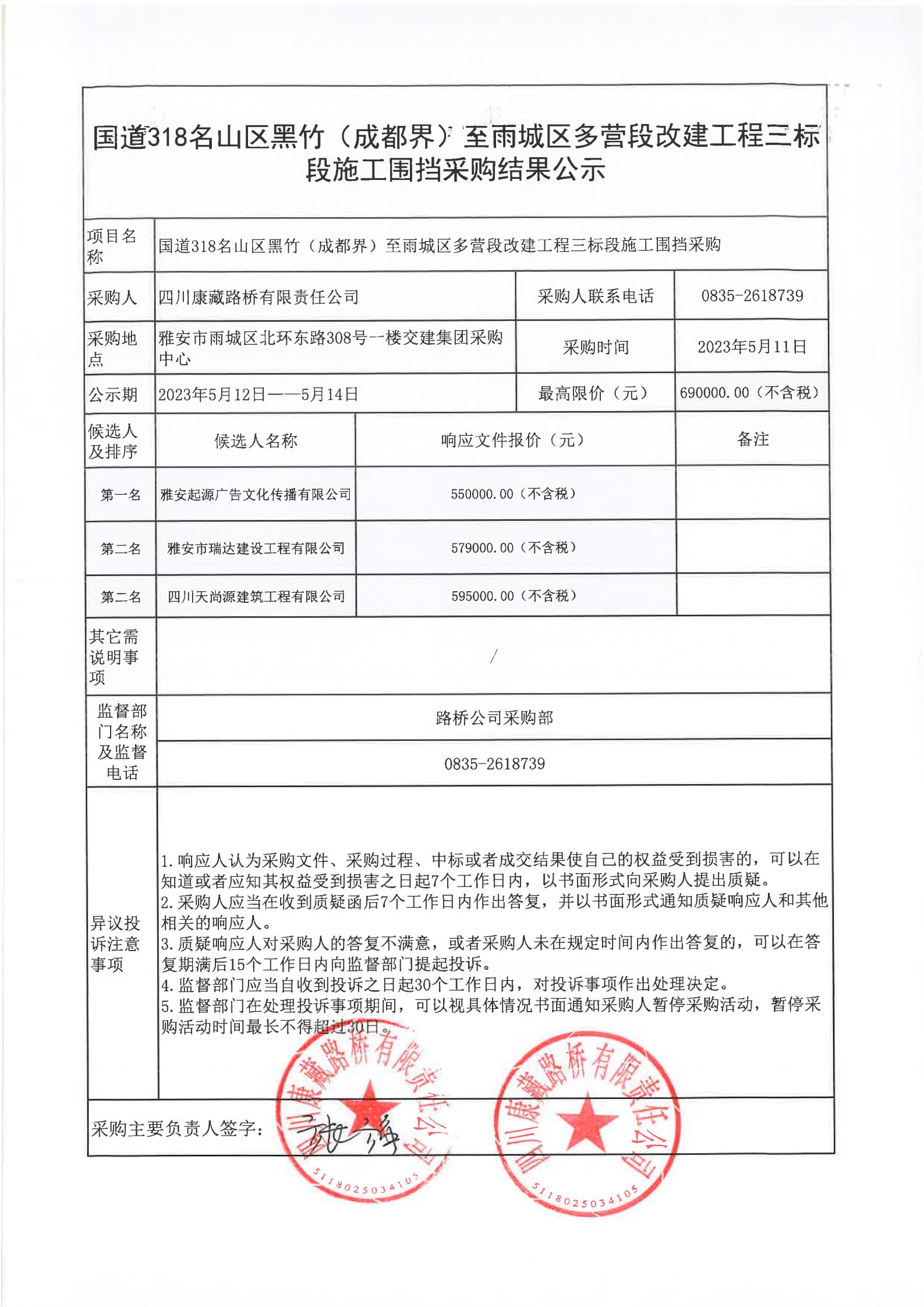 四川康藏路橋有限責(zé)任公司國道318名山區(qū)黑竹(成都界)至雨城區(qū)多營段改建工程三標(biāo)段施工圍擋采購結(jié)果公示