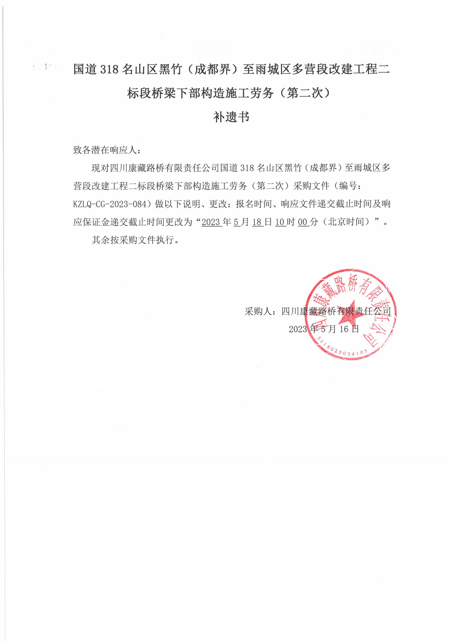四川康藏路橋有限責任公司國道318名山區(qū)黑竹(成都界)至雨城區(qū)多營段改建工程二標段橋梁下部構(gòu)造施工勞務(wù)(第二次)補遺書