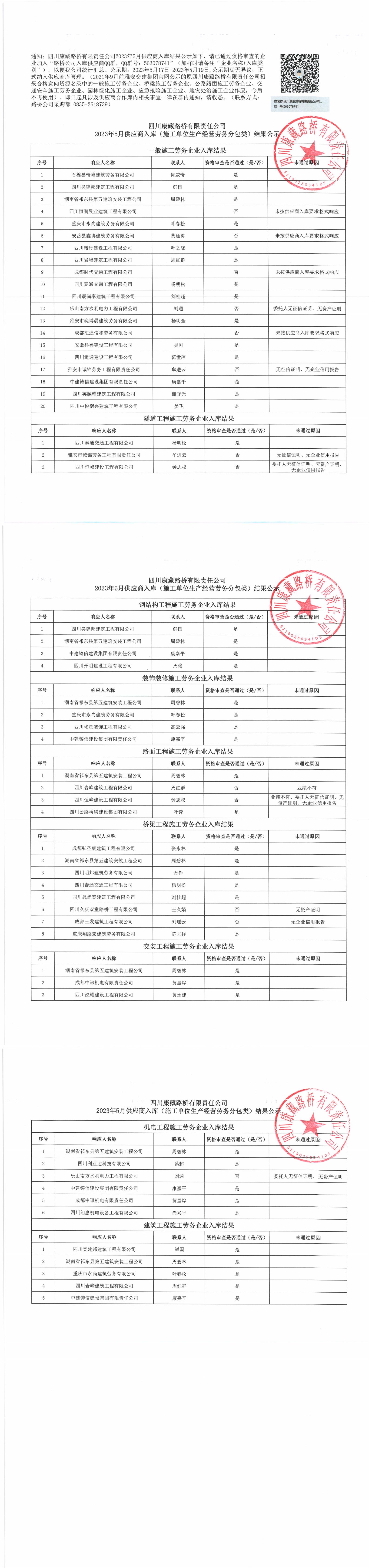 四川康藏路橋有限責(zé)任公司2023年5月供應(yīng)商入庫(施工單位生產(chǎn)經(jīng)營勞務(wù)分包類)結(jié)果公示