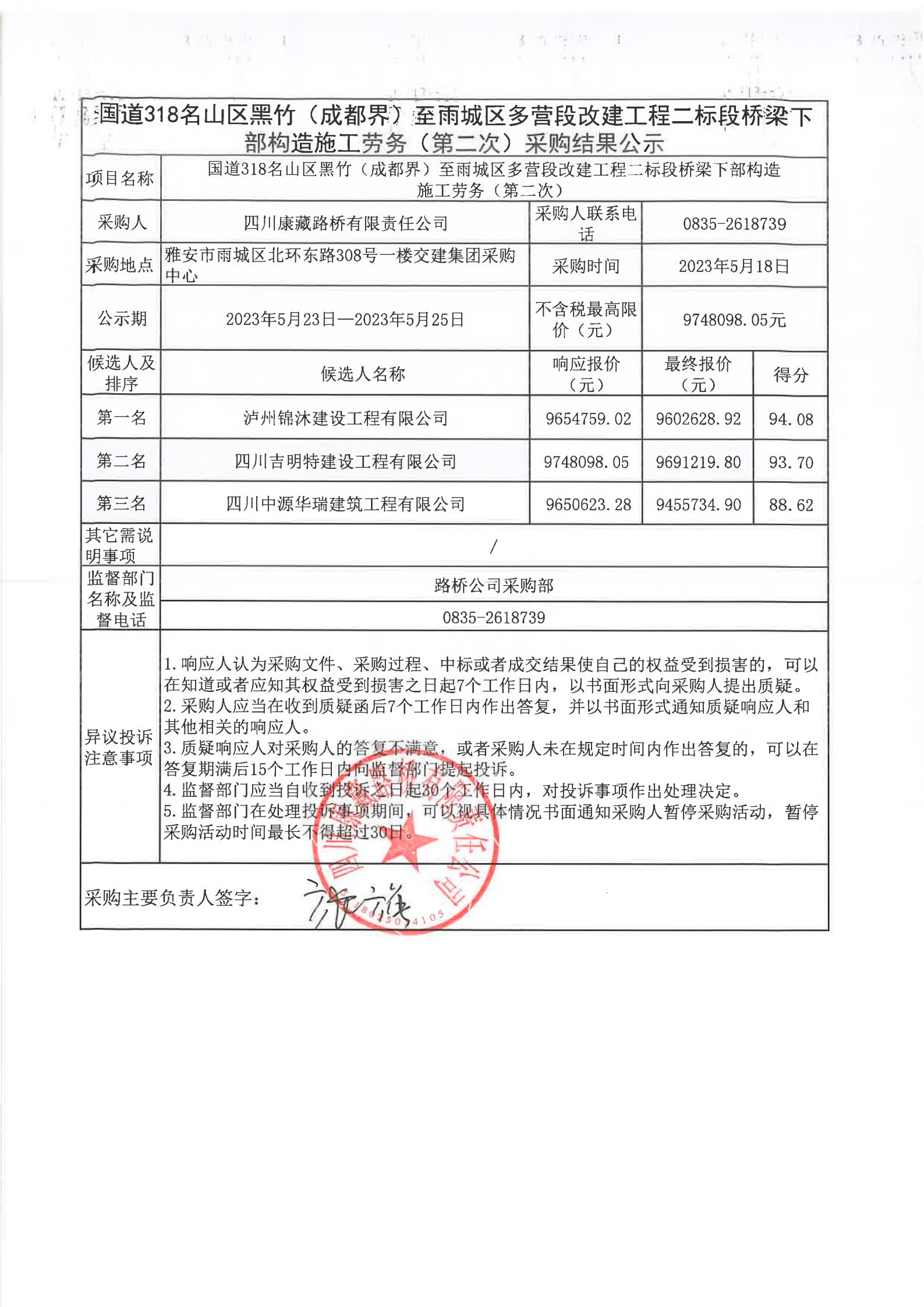 四川康藏路橋有限責(zé)任公司國道318名山區(qū)黑竹(成都界)至雨城區(qū)多營段改建工程二標段橋梁下部構(gòu)造施工勞務(wù)(第二次)采購結(jié)果公示