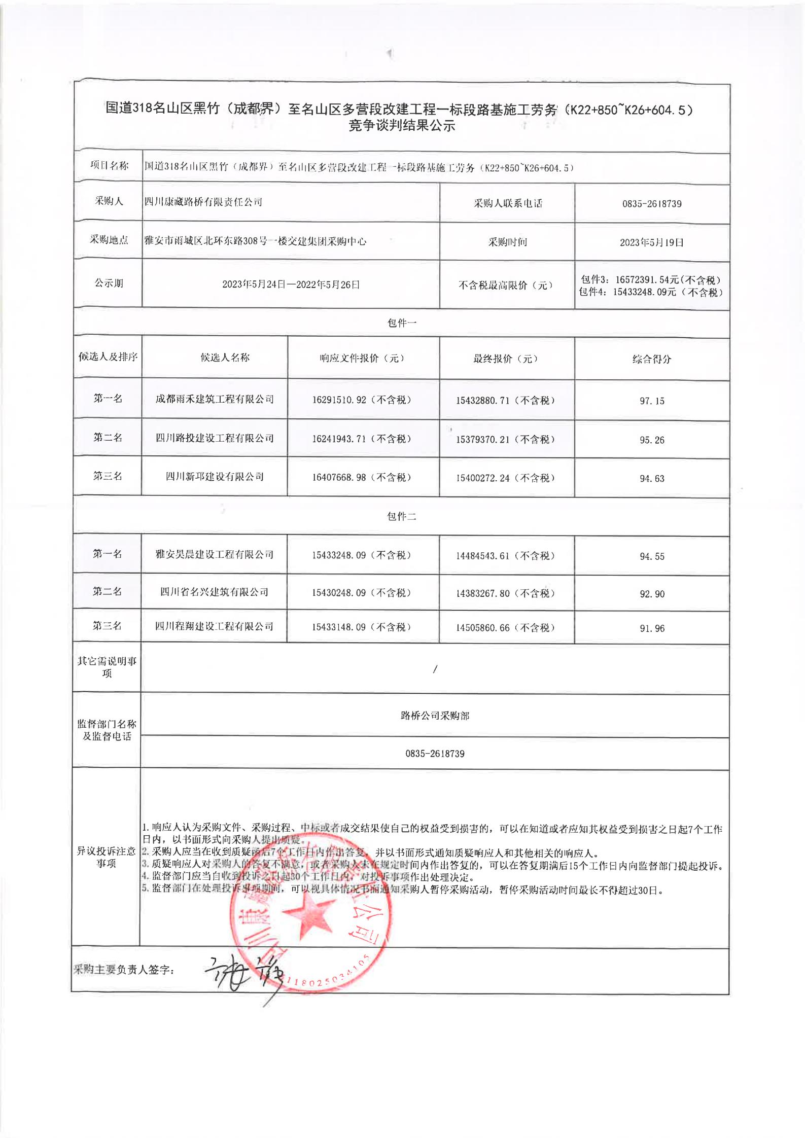 四川康藏路橋有限責(zé)任公司國道318名山區(qū)黑竹(成都界)至雨城區(qū)多營段改建工程一標(biāo)段路基施工勞務(wù)(K22+850~K26+604.5)競(jìng)爭談判結(jié)果公示