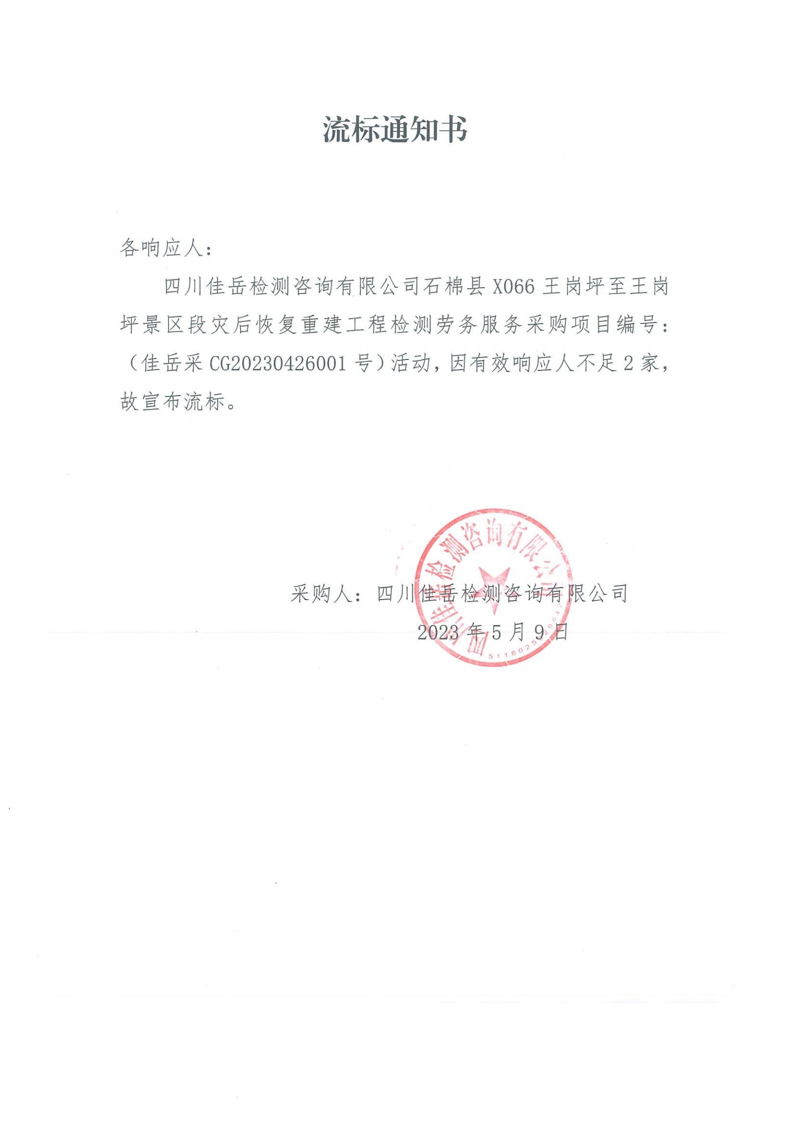 四川佳岳檢測咨詢有限公司石棉縣X066王崗坪至王崗坪景區(qū)段災后恢復重建工程檢測勞務服務流標通知