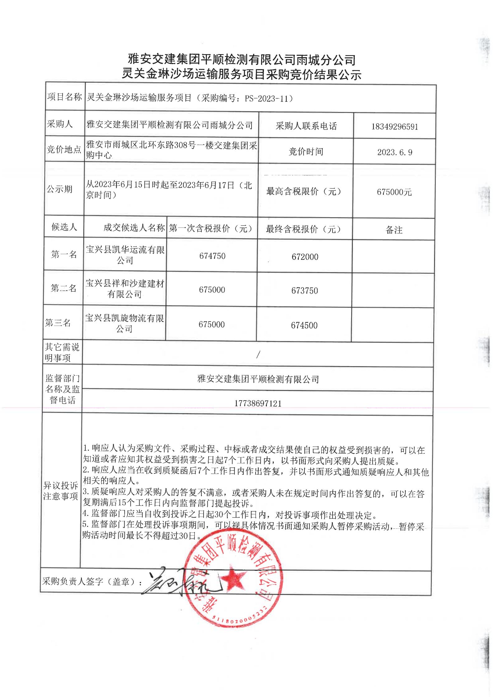 雅安交建集團(tuán)平順檢測有限公司雨城分公司靈關(guān)金琳沙場運(yùn)輸服務(wù)競價(jià)結(jié)果公示