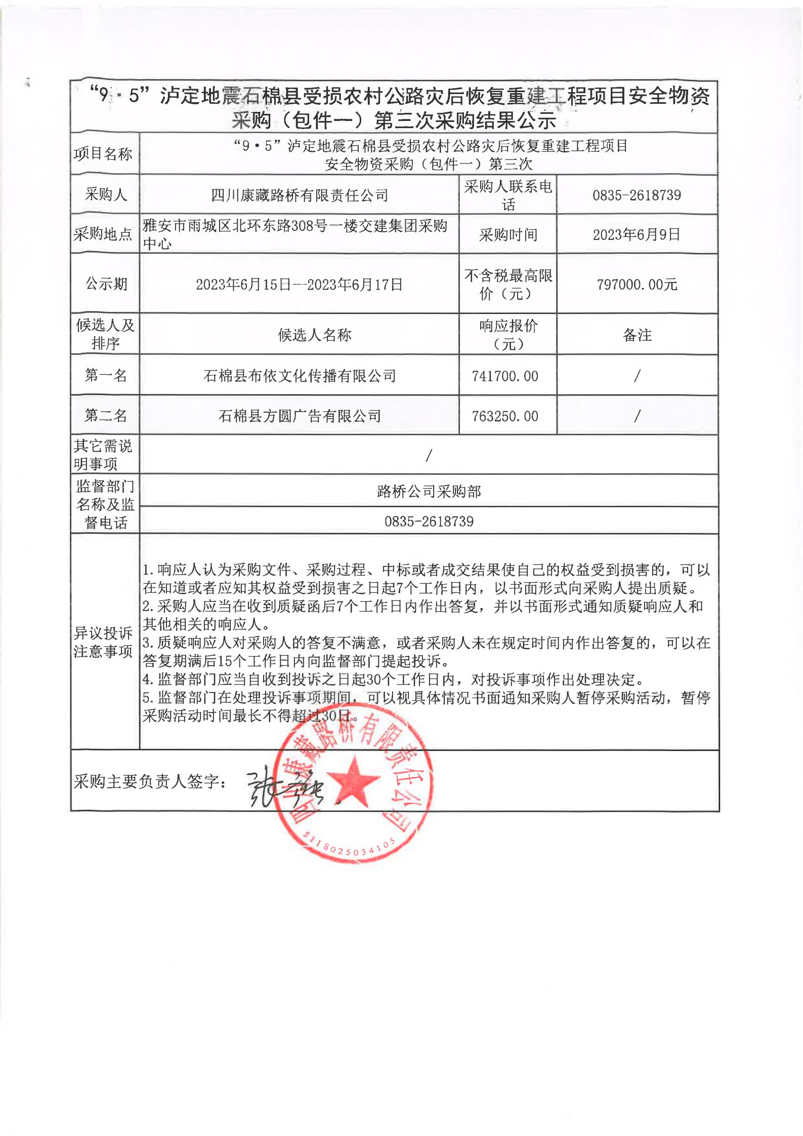 四川康藏路橋有限責任公司“9·5”瀘定地震石棉縣農(nóng)村公路災(zāi)后恢復(fù)重建工程項目安全物資采購(包件一)第三次采購結(jié)果公示