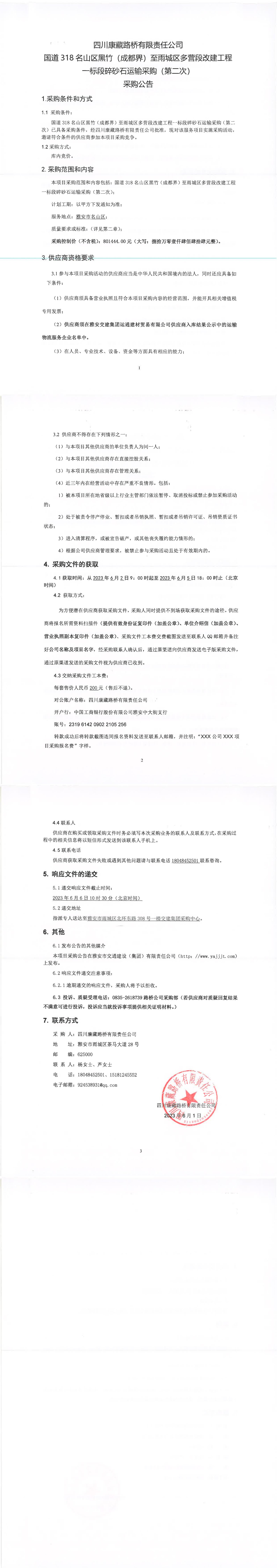 四川康藏路橋有限責(zé)任公司國道318名山區(qū)黑竹(成都界)至雨城區(qū)多營段改建工程一標段碎砂石運輸采購(第二次)采購公告