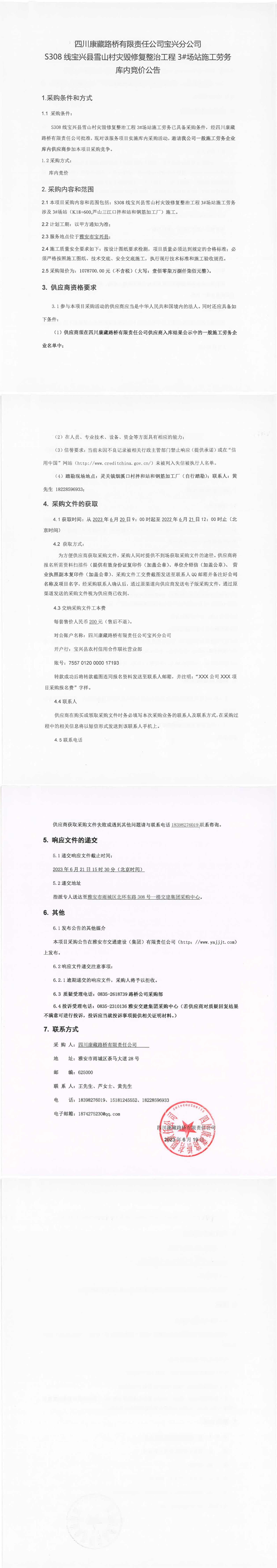 四川康藏路橋有限責(zé)任公司寶興分公司S308線寶興縣雪山村災(zāi)毀整治工程3#場站施工勞務(wù)庫內(nèi)競價公告