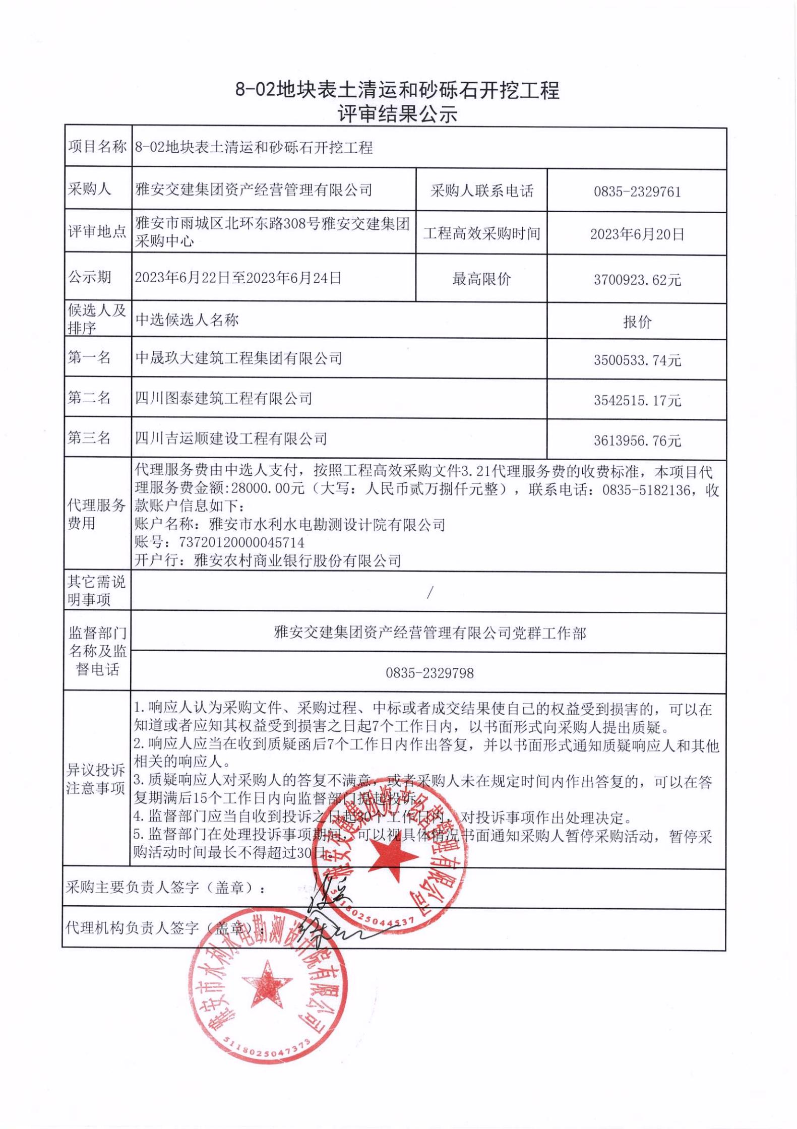 雅安交建集團(tuán)資產(chǎn)經(jīng)營管理有限公司8-02地塊表土清運(yùn)和砂礫石開挖工程項目評審結(jié)果公示