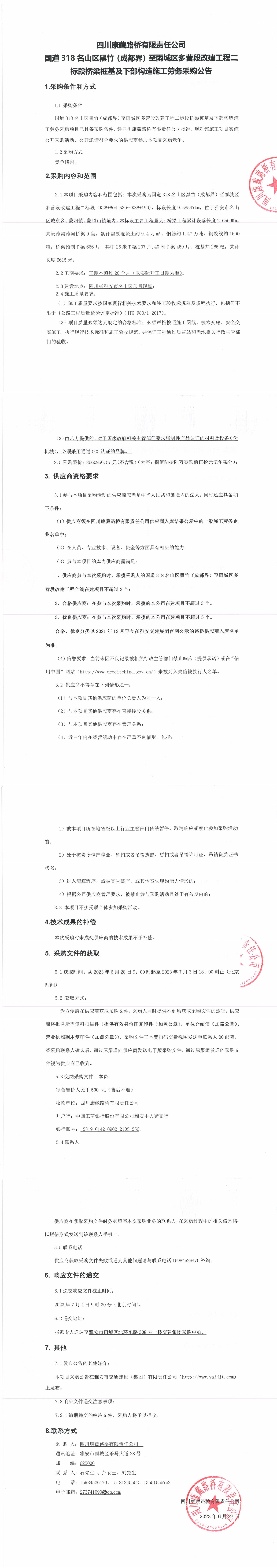 四川康藏路橋有限責(zé)任公司國(guó)道318名山區(qū)黑竹(成都界)至雨城區(qū)多營(yíng)段改建工程二標(biāo)段橋梁樁基及下部構(gòu)造施工勞務(wù)采購公告
